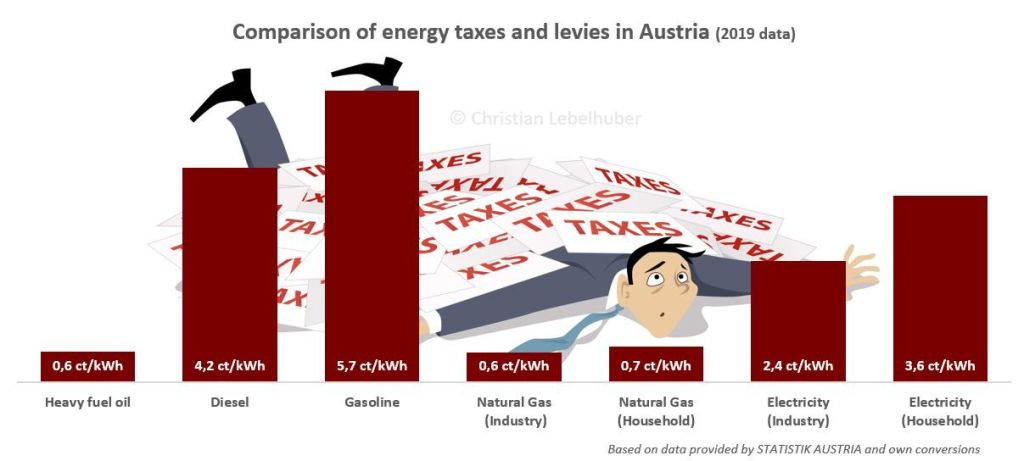 This is the noble objective. The ‘reality check’ of energy taxes and levies applied in Austria to different energy carriers shows a pretty different picture (see figure) and makes clear that there is quite some way to go.